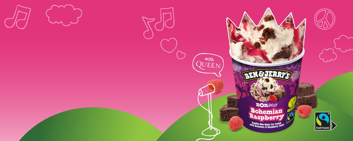 Vegansk vaniljglass med browniebitar och hallonsås
